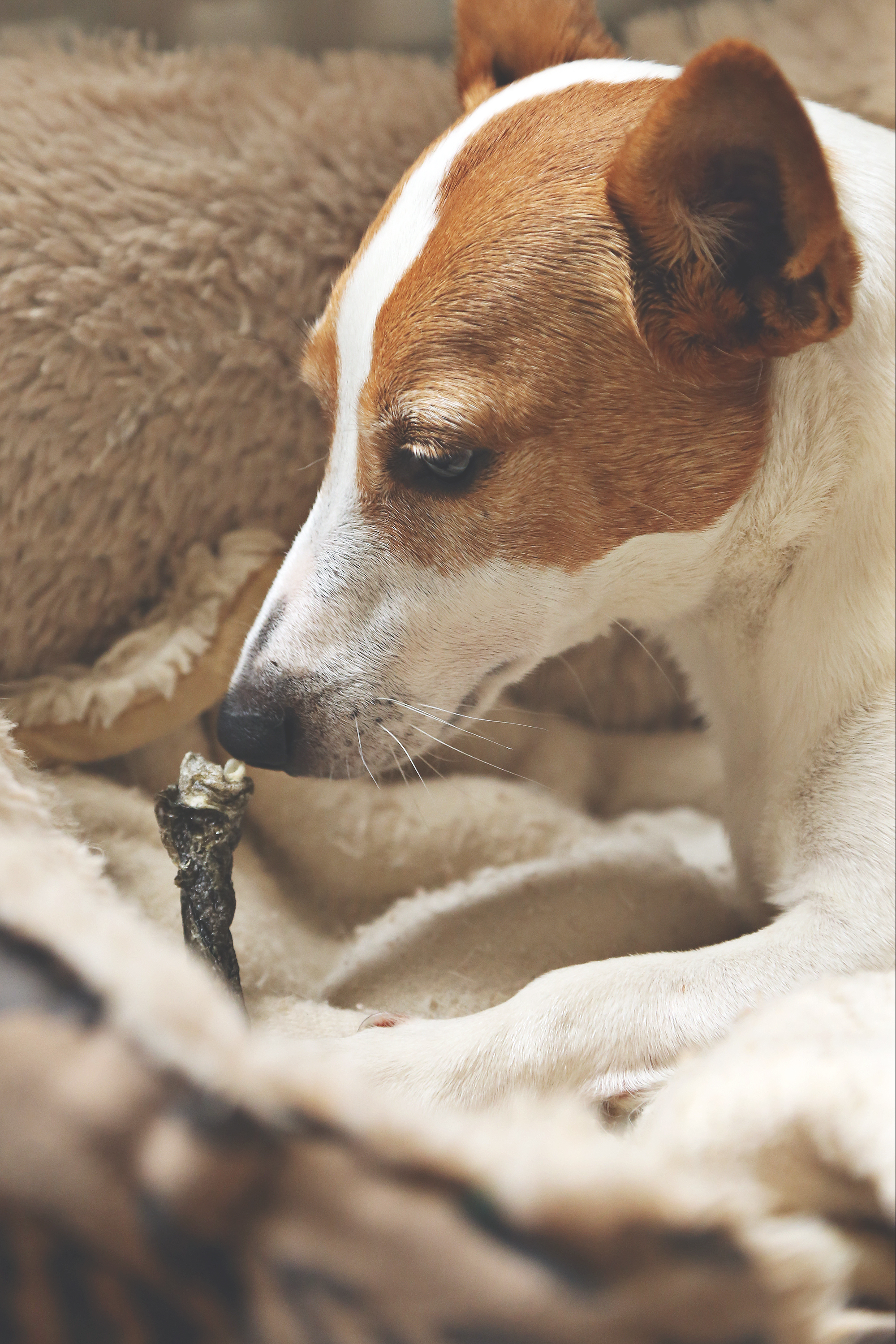 I open the bag and inside are an abundance of the fishy twiglets, Molly is very interested at this stage. She circles my feet enthusiastically with her head up, nose stuck in the air and looking hopeful for something to fall out of the bag and into her mouth.